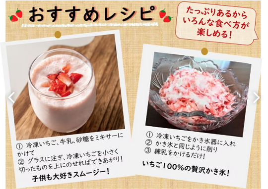 「苺スムージー」、「そのまんま苺のかき氷」、「苺のシロップ漬け」、「苺ミルク」、「苺ゼリー」、「苺シェイク」、「苺ジャム」etc・・・・