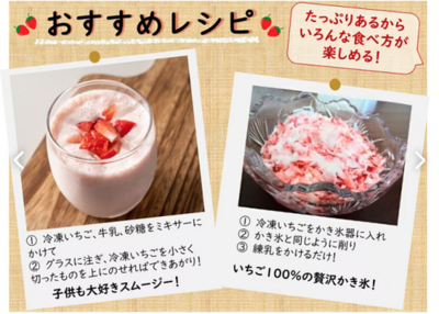 「苺スムージー」、「そのまんま苺のかき氷」、「苺のシロップ漬け」、「苺ミルク」、「苺ゼリー」、「苺シェイク」、「苺ジャム」etc・・・・
