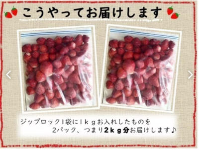いちご(良質のいちごの他、傷物、変形等の訳ありいちごも含みます)を洗浄し、へた、傷部分を取り除いて冷凍させたものをジップロックに入れてお届けします。使いやすいよう1Kg毎に小分けにしました。